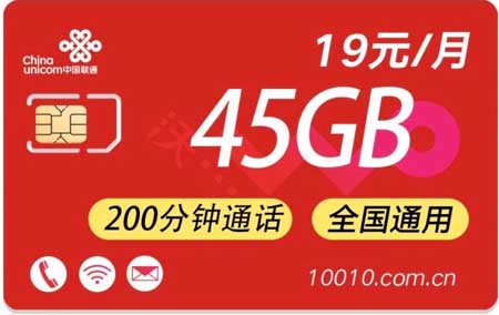 江苏镇江19元月租45G通用,30G省内,200分钟通话