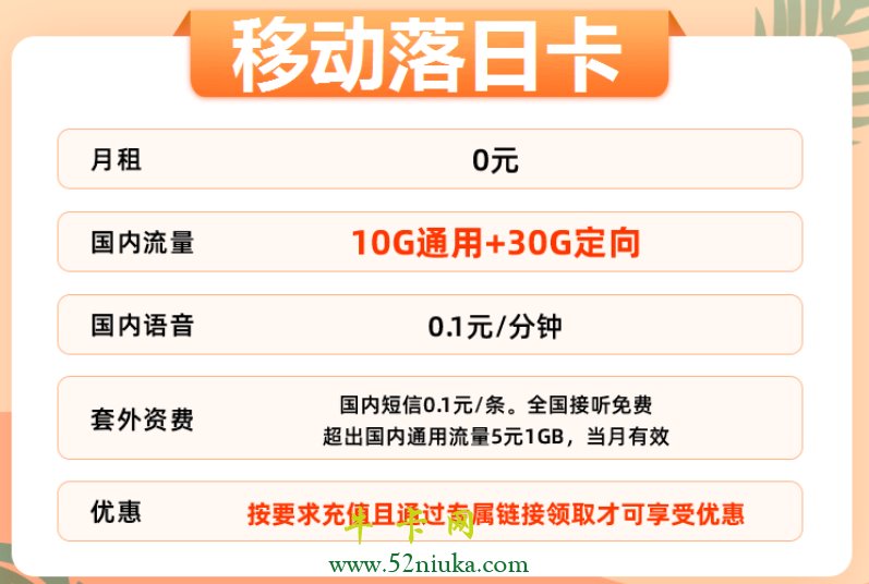 今天看到好几个关于移动落日卡的海报,号称0元10G通用+30G定向,那么这款移动落日卡套餐怎么样呢?真的就是如海报中宣传的那样吗?下面来看看这个套餐详情: