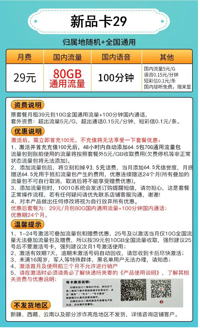 优惠后套餐为:29元/月包80G国内通用流量+100分钟国内通话;